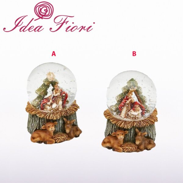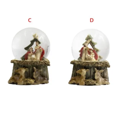 La Sfera di vetro con neve al suo interno ha una capanna che rappresenta un abete sotto al quale c’è la natività avorio con un tocco di rosso; essa è poggiata su una base di gesso raffigurante un tronco di quercia con il bue e l’asinello.
