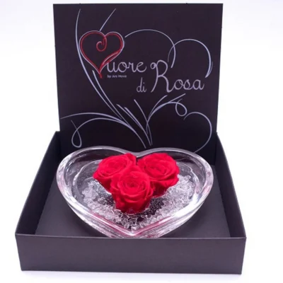 Cuore in Vetro con 3 Rose Stabilizzate Rosse: un simbolo di amore eterno. Disponibile in due dimensioni, questo cuore apribile dona eleganza e fragranza duratura.