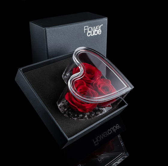 Le Flowercube a forma di cuore sono poste all’interno di un involucro di plexiglass trasparente che le custodirร  elegantemente, il tutto racchiuso all’interno di una scatola nera.