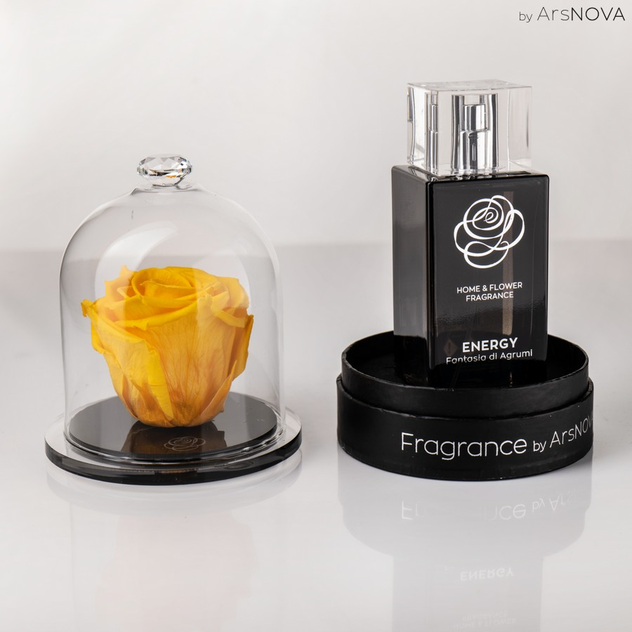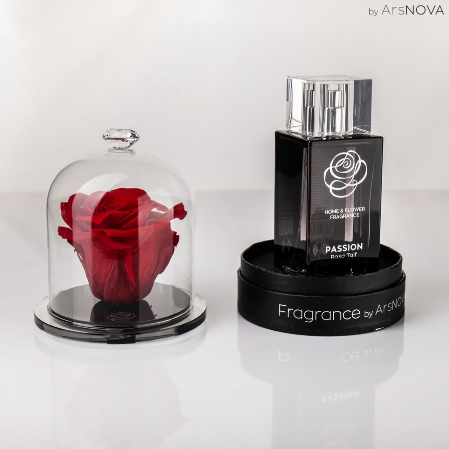 Il Set comprende: Una Rosa Stabilizzata in una cupola di vetro + un profumo spray da 100 ml
